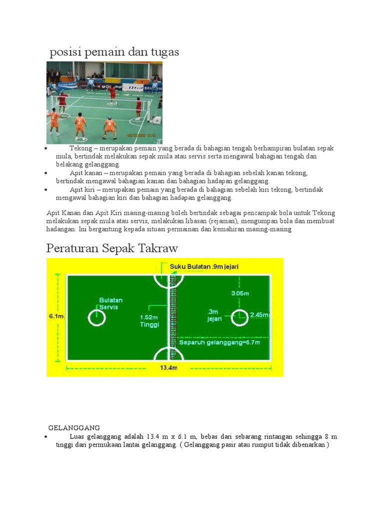 Sepak takraw adalah cabang olahraga yang merupakan kombinasi antara permainan voli dengan sepak bola yang dimainkan dilapangan. Posisi dan jumlah pemain sepak takraw. A Betul b Salah 16 Pemain dibenarkan untuk menggunakan.